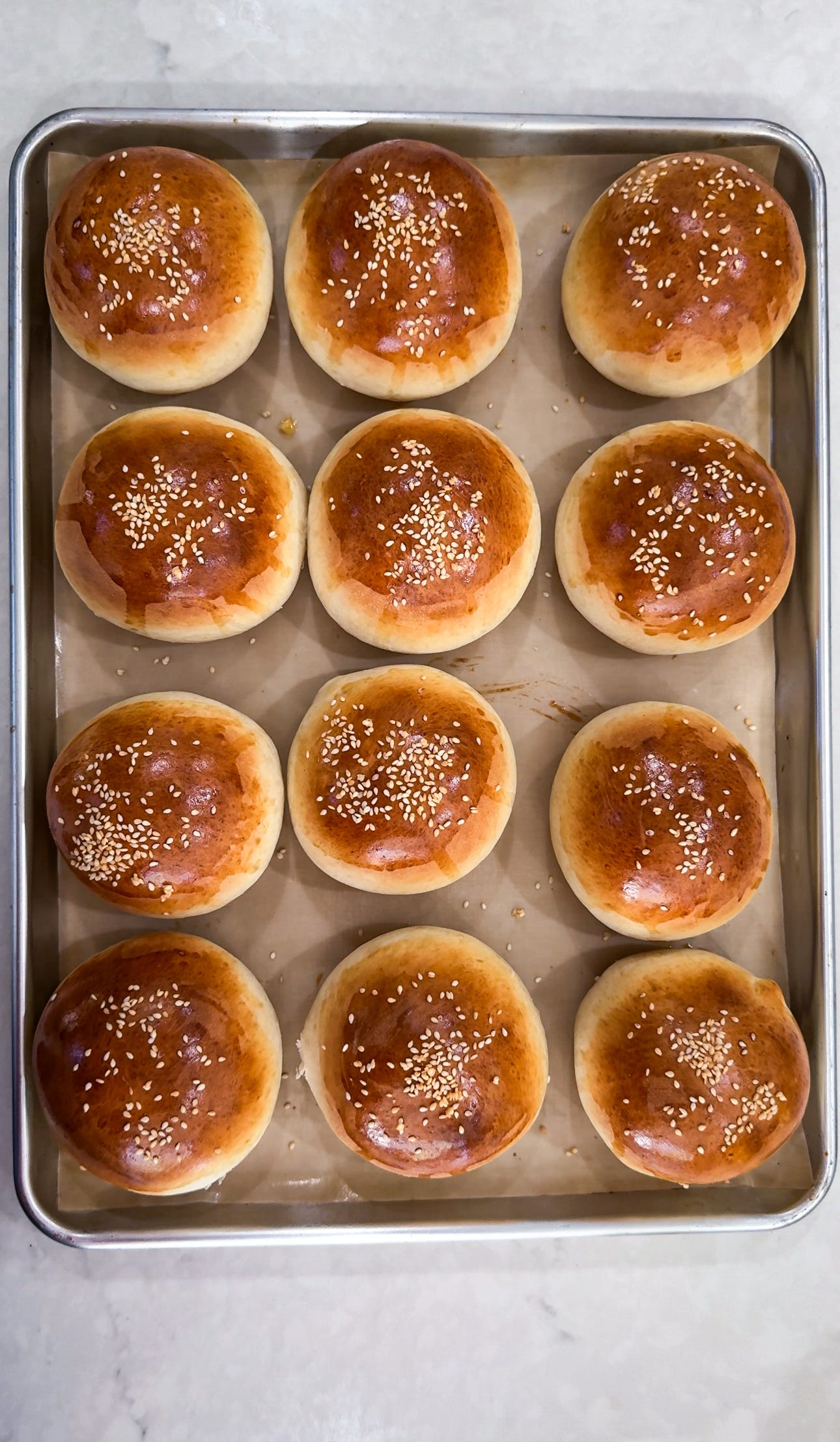 Super soft, airy and perfectly golden burger buns with a rich, tender crumb.